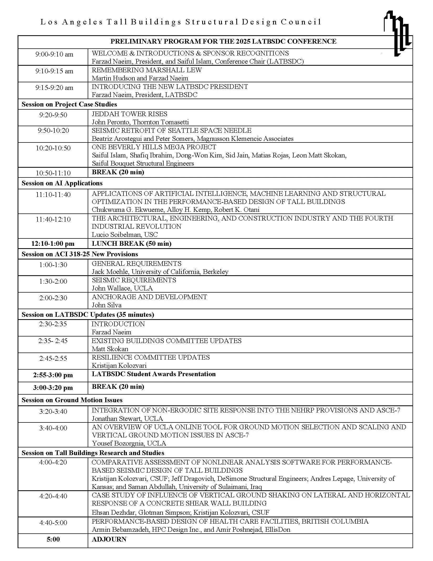 The 2025 LATBSDC conference will be held on November 21, 2025. The conference will cover a variety of topics related to recent advances in the structural design of tall and special buildings. Unique case studies of recent projects will be presented, followed by sessions on new ACI 318-25 provisions, AI applications in structural engineering and construction, ground motion issues, various research topics, and updates from LATBSDC committees.